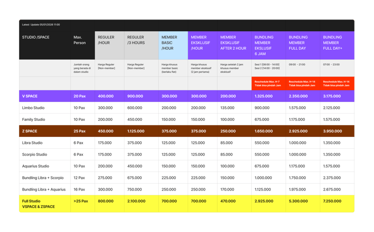 Tabel perbandingan harga sewa studio reguler & member